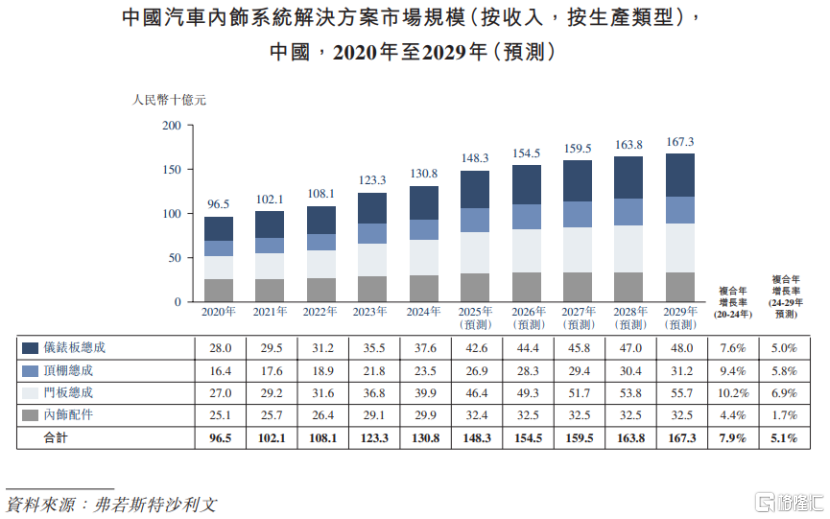 受益于汽车智能化的持续渗透、个性化定制的兴起以及绿色轻量化材料的应用,预计2029年汽车内饰系统解决方案市场将达到1673亿元,2024年至2029年的复合年增长率为5.1%。