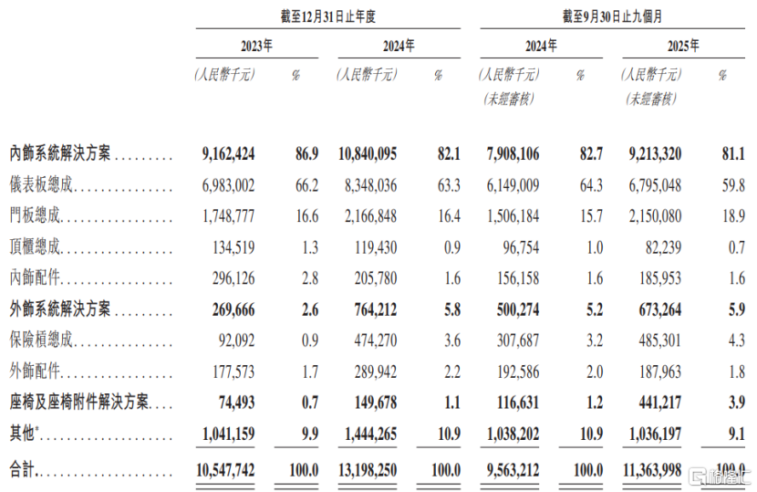 具体来看,2023年、2024年、2025年1-9月(简称“报告期”),新泉股份超过80%的收入来自内饰系统解决方案,其中,仪表板总成贡献了约60%的收入,门板总成的收入占比在16%左右。