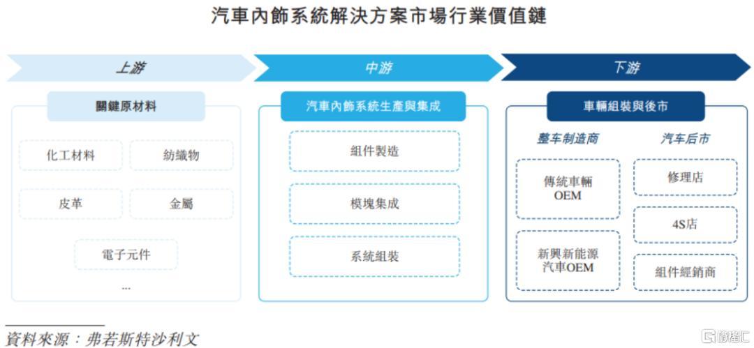 汽车内饰产业链上游主要为原材料供应,包括化工材料、纺织物、皮革及电子元件,作为制造内饰部件的基材及填充物。