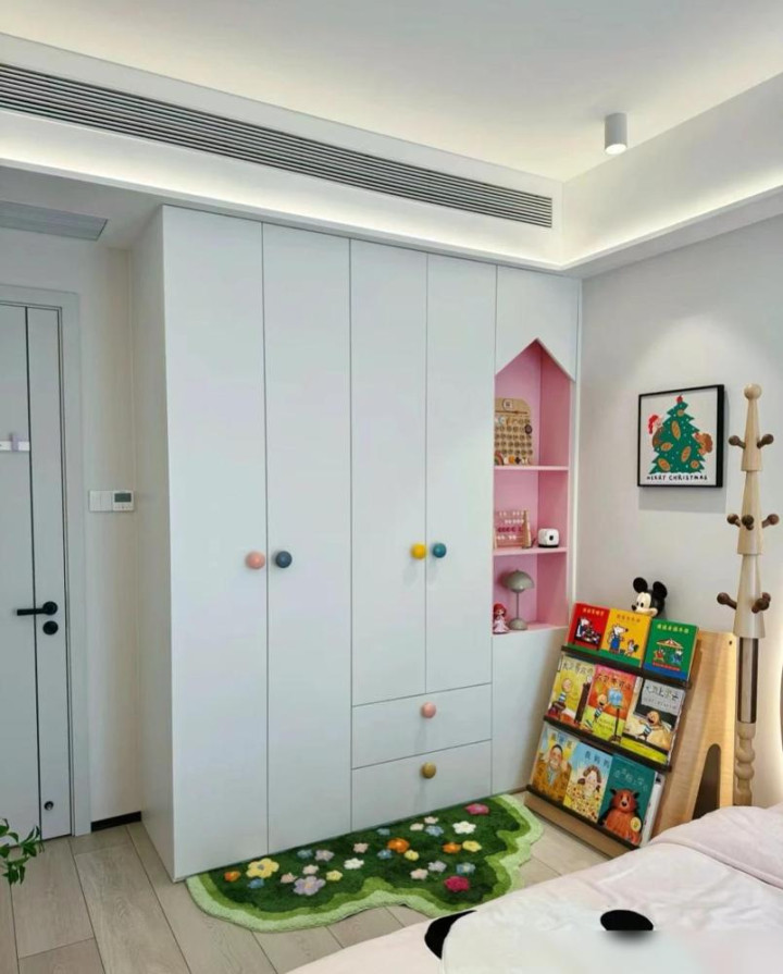卧室设计比较常规,一门到顶的衣柜简洁大方。女儿房的粉色系搭配很可爱,但孩子长大可能就不喜欢了。儿童房装修还是得考虑长远些,中性色调更耐看。